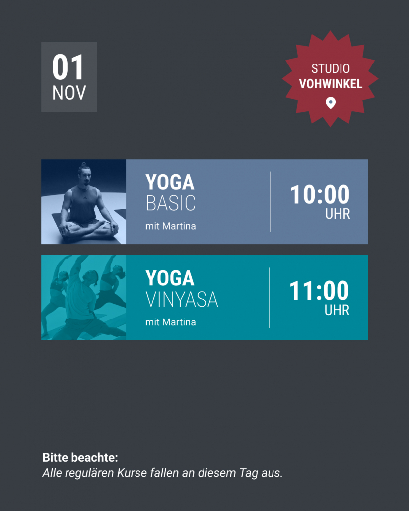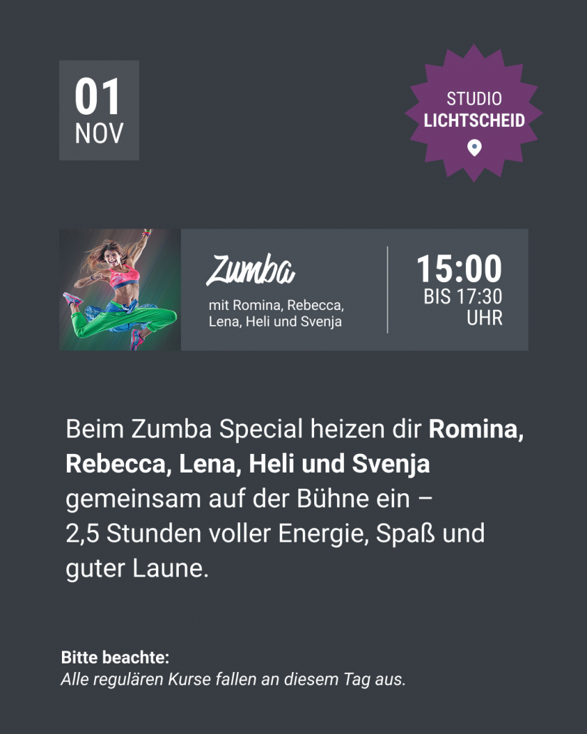Verbringe den Feiertag aktiv: intensive Les-Mills-Vibes, heißer Zumba-Beat oder entspannte Yoga-Flows — drei Studios, drei Stimmungen.